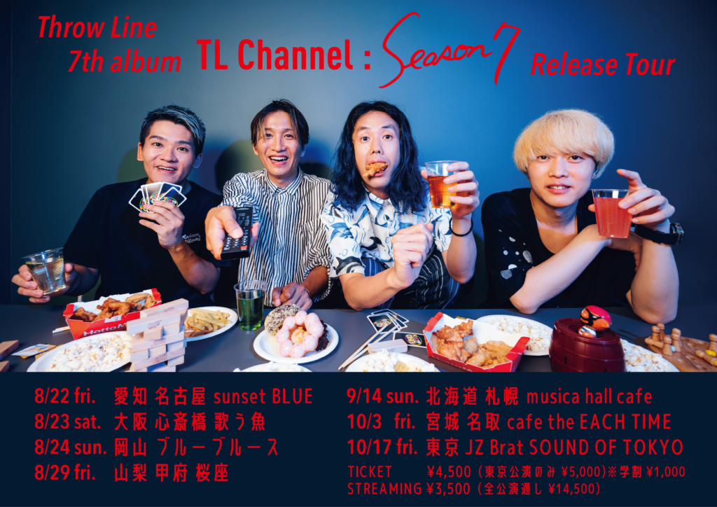 フルバンド編成による豪華東京ワンマン開催決定! Throw Lineの2026年初東京ワンマン!豪華フルバンド編成によるスペシャルライブが開催決定しました。 「セッション」をテーマに、トロンボーンカルテット×生バンドが織りなす迫力と彩りに満ちたサウンドをお楽しみください!セッションから生まれる一体感と、ここでしか味わえないアレンジ、グルーヴを、ライブならではの臨場感とともに。昼夜2公演、それぞれ異なる表情をお届けします。 ■5/6(水祝)東京 JZ Brat SOUND OF TOKYO「Throw Line Special Session 2026」入替制1st Open 14:00 Start 15:00(16:30終演予定)2nd Open 17:30 Start 18:30(20:00終演予定) 詳細はスケジュールページをご覧ください! 地元凱旋ツアー開催! 「Throw Line」のメンバー4人それぞれの地元で凱旋公演をするツアーを開催いたします! 各公演をそれぞれ地元のメンバーがプロデュースし、その土地ならではのお楽しみをお届けいたします。皆さまのご来場をお待ちしております! 3/15(日)山梨 甲府桜座4/11(土)岡山 ブルーブルース4/12(日)鳥取 米子BE GOOD HALL4/29(水祝)鹿児島 キャパルボライブヘブン 詳細はスケジュールページをご覧ください! 2025年の集大成ホールワンマンコンサート無事終了! 7枚目のアルバム「TL Channel : season 7」のリリースとツアーを経て、2025年の集大成は「劇場版」と名付けてホールワンマンコンサートを開催しました。新譜の楽曲もフルバンドセット(ギター、ベース、ピアノ、ドラムを入れた生バンド編成)で初披露!大盛況のうちに幕を閉じました。 2025/11/16(日)Throw Line Special Concert 2025 〜劇場版TL Channel : season 7〜TIAT SKY HALL ご来場くださった皆様、応援してくださった皆様、本当にありがとうございました! 当日会場にてご来場の皆様に無料配布したプログラムのPDFデータを公開いたします。セットリスト等の情報が掲載されています。ぜひご覧ください! → 2025.11.16 来場者配布プログラム 7th album「TL Channel : season 7」 2025.8.22 Release 1. Serendipity 2.黎明の約束 3.Inner Resistance 4.すかしてんじゃねぇ 5.酸素欠乏アルカディア 6.ロマンスが降る 7.sea you 8.言葉のない歌 9.ひと駅分のラブソング 10.konomichi 通販ページにて絶賛ご予約受付中! 7th Album Release Tour 開催決定! Throw Lineの7枚目となるアルバムリリースに伴いリリースツアー全7公演が開催決定! 「Throw Line 7th album Release Tour」8/22(金)愛知 名古屋sunset BLUE8/23(土)大阪 心斎橋 歌う魚8/24(日)岡山 ブルーブルース8/29(金)山梨 甲府 桜座9/14(日)北海道 札幌musica hall cafe10/3(金)宮城 名取cafe the EACH TIME10/17(金)東京 JZ Brat SOUND OF TOKYO 合わせて今年初のファンミーティングも開催いたします。 8/23(土)大阪 心斎橋 歌う魚9/13(土)北海道 札幌musica hall cafe チケット情報など、詳細はscheduleページをご覧ください。各地で皆さまにお会いできることを楽しみにしております! 2024年の集大成そして新体制初となるフルバンド編成ワンマン無事終了! 6枚目のアルバム「By Your Side」のリリース、ツアーを経てさらにグルーヴの高まったThrow Line。新体制になって初めてのフルバンドセット(ギター、ベース、ピアノ、ドラムを入れた生バンド編成)でのワンマンコンサートを開催!大盛況のうちに幕を閉じました。 2024/12/28(土)Throw Line Special Concert 2024 〜By Our Side〜TENNOZ KIWA アルバムタイトルの「By Your Side」は「あなたの日常に寄り添う音楽を」というイメージでつけられた名前ですが、ワンマンのサブタイトルは「By Our Side」。アルバムとは対照的なイメージで「僕らに会いに来てほしい」という気持ちを込めてつけました。 そして実際にたくさんのお客様に会いに来ていただけて、とても心に残る1日となりました。 ご来場くださった皆様、応援してくださった皆様、本当にありがとうございました! 当日会場にてご来場の皆様に無料配布したプログラムのPDFデータを公開いたします。セットリスト等の情報が掲載されています。ぜひご覧ください! → 20241228プログラム 6th album「By Your Side」 2024.9.21 Release 1.nexus (album ver.) 2.withblue 3.she tea 4.Meteor Shower 5.ゆらめき 6.R318 7.ビアビアベアー 8.謎子 9.また会おうね。 ライブ会場および通販にて販売中! 6th album「By Your Side」トレイラー 6th Album「By Your Side」Release Tour 無事終了! Throw Lineの6枚目となるアルバム「By Your Side」が2024年9月21日にリリース!それに伴いリリースツアー全7公演を開催し、無事に終了いたしました!ご来場くださった皆様、配信でご覧くださった皆様、本当にありがとうございました! 「Throw Line 6th album 『By Your Side』Release Tour」9/21(土)岡山 ブルーブルース9/22(日)大阪 Soap opera classics -Umeda-9/23(月祝)愛知 名古屋sunset BLUE9/27(金)神奈川 新横浜LiT9/28(土)山梨 甲府COTTON CLUB10/5(土)宮城 名取cafe the EACH TIME10/14(月祝)東京 渋谷LOFT HEAVEN 新体制お披露目ツアー無事終了! 2024年1月から新メンバー みやけんを迎え、新たな4人でのスタートを切ったThrow Line。初めてのツアー全5公演が無事に終了いたしました。ご来場くださった皆様、配信でご覧くださった皆様、ありがとうございました! 「Throw Line 新体制